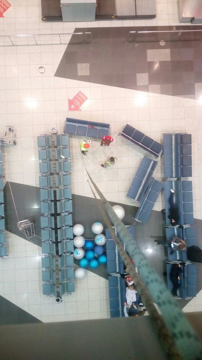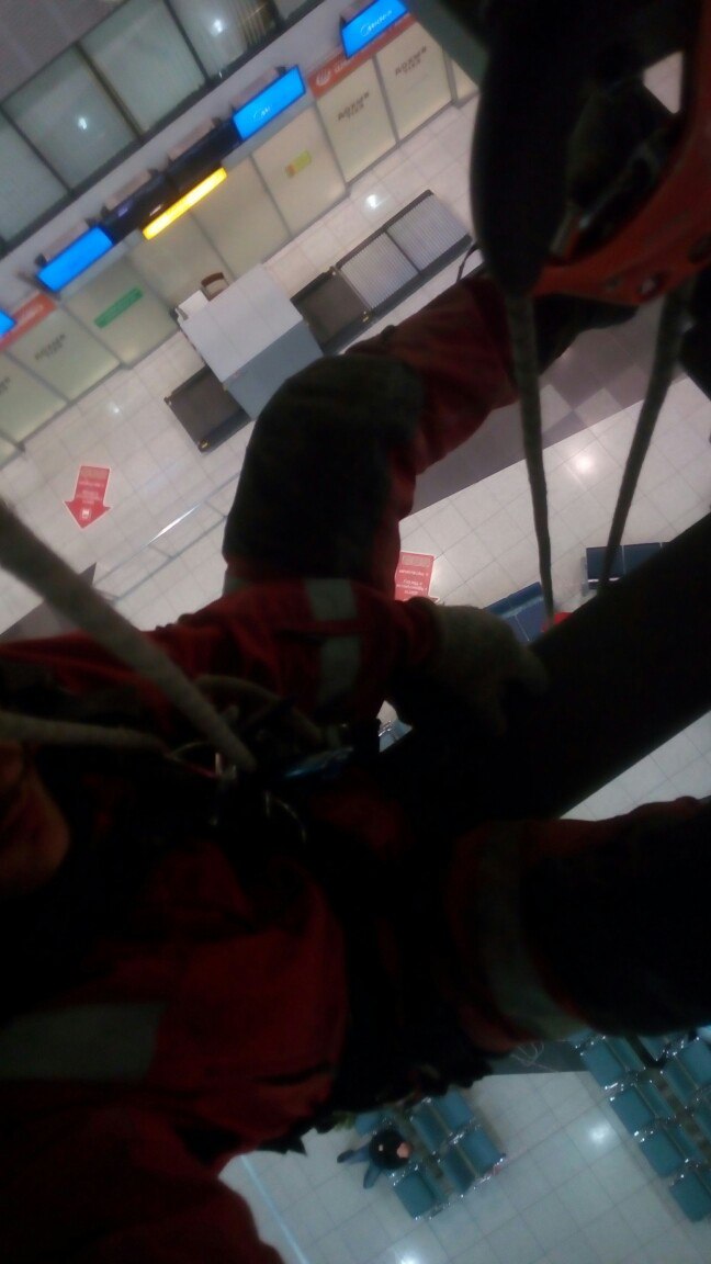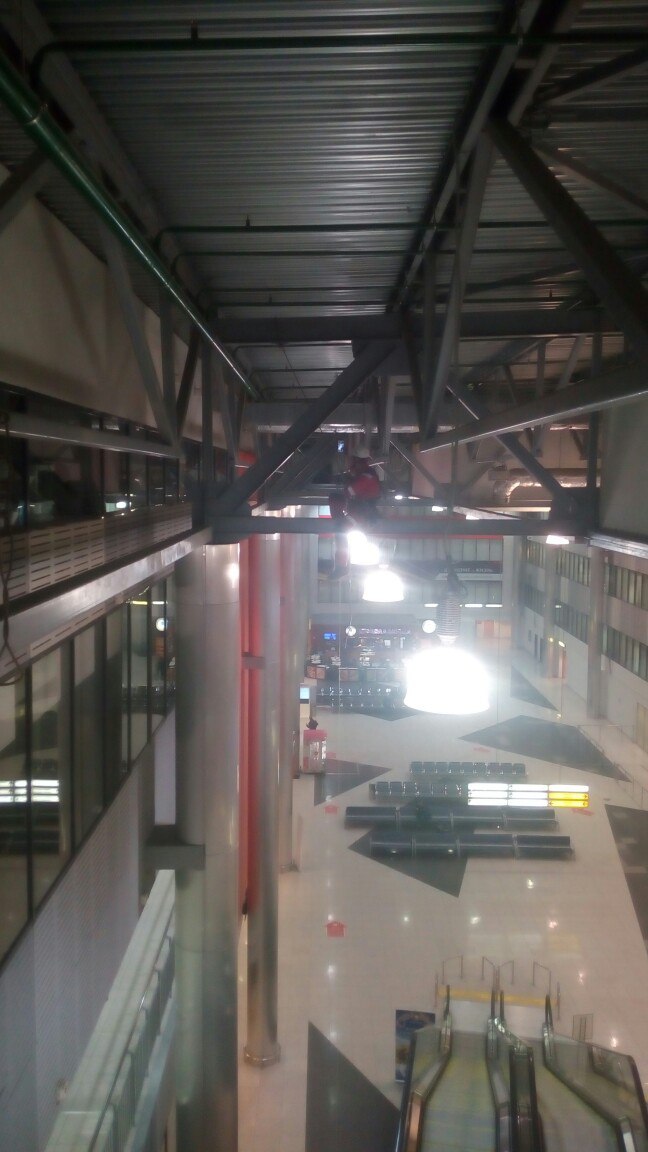 Высота потолка 15 метров. Режимный объект. Задача ставилась смонтировать так, чтобы не мешать пассажирам.