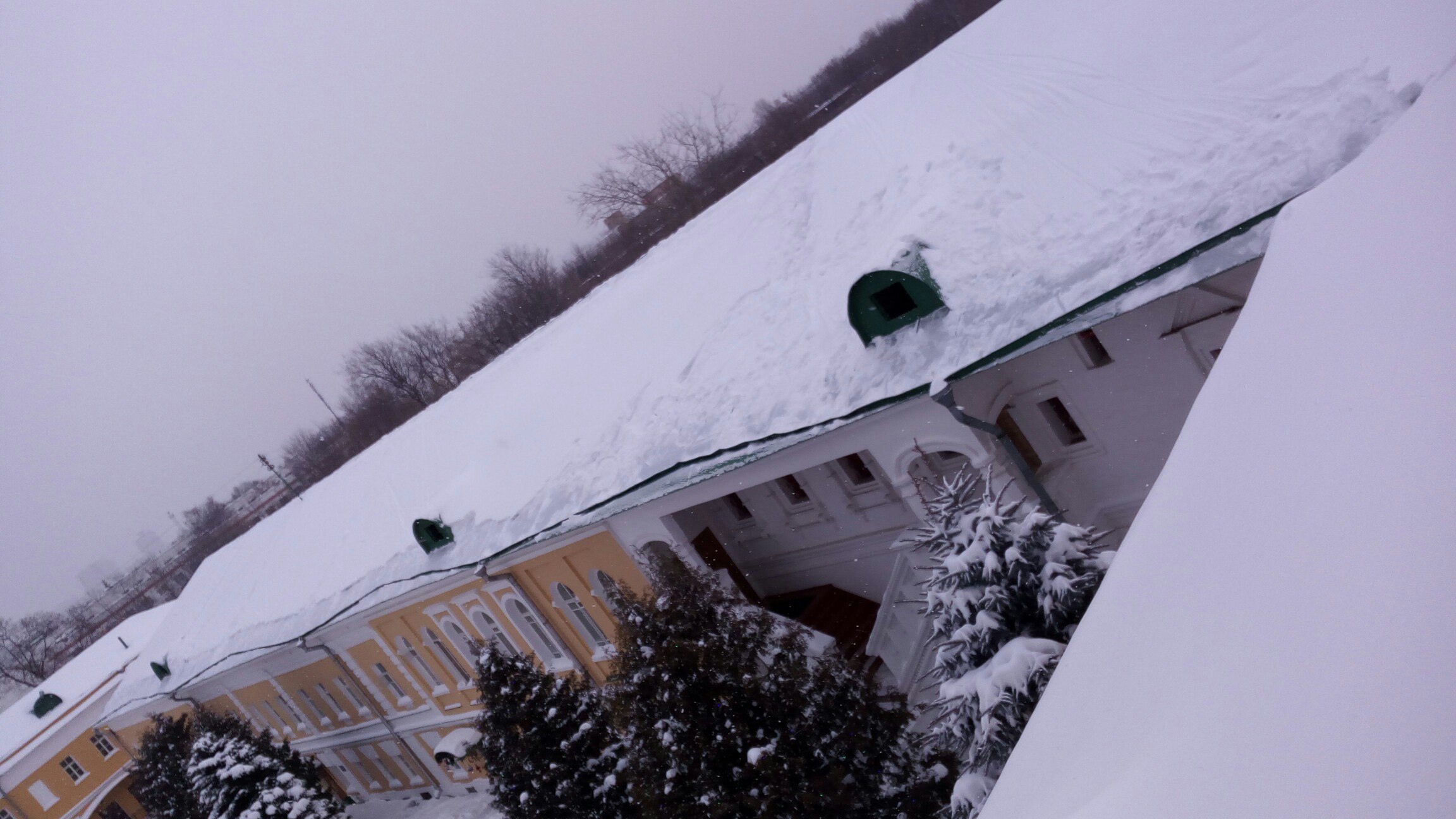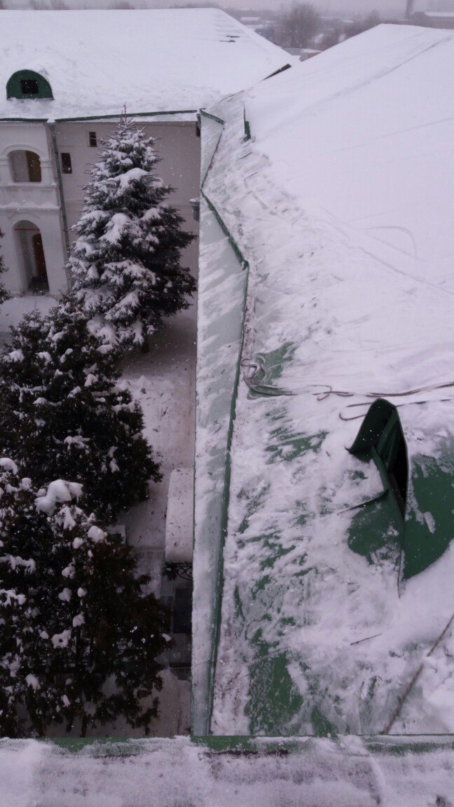 Уборка снега с крыш храма и других помещений Николо-Перенский монастыря.