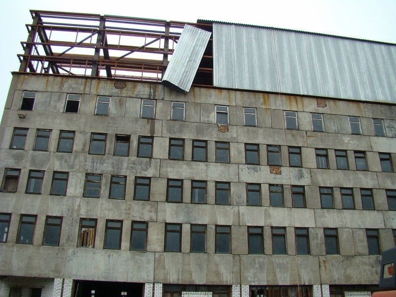 Демонтаж аварийного профлиста на техническом этаже заводского корпуса.